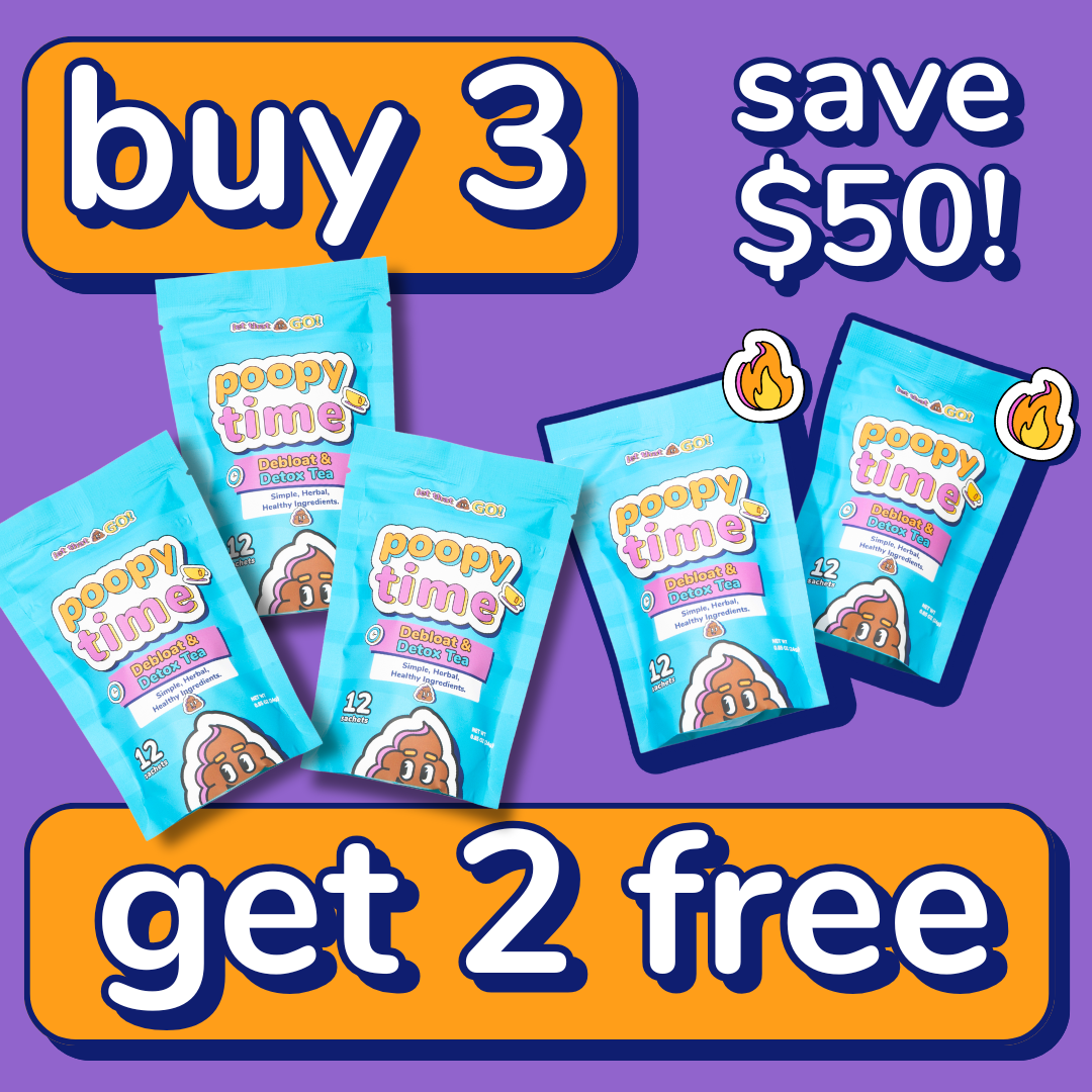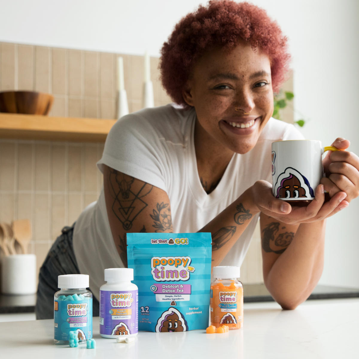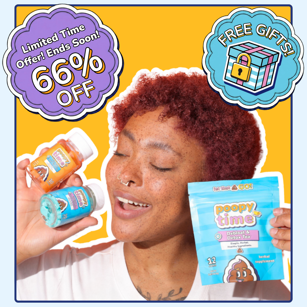 Poopy Time was formulated to crush bloating, give you a good cleanse, and leave you with a flatter tummy! *
